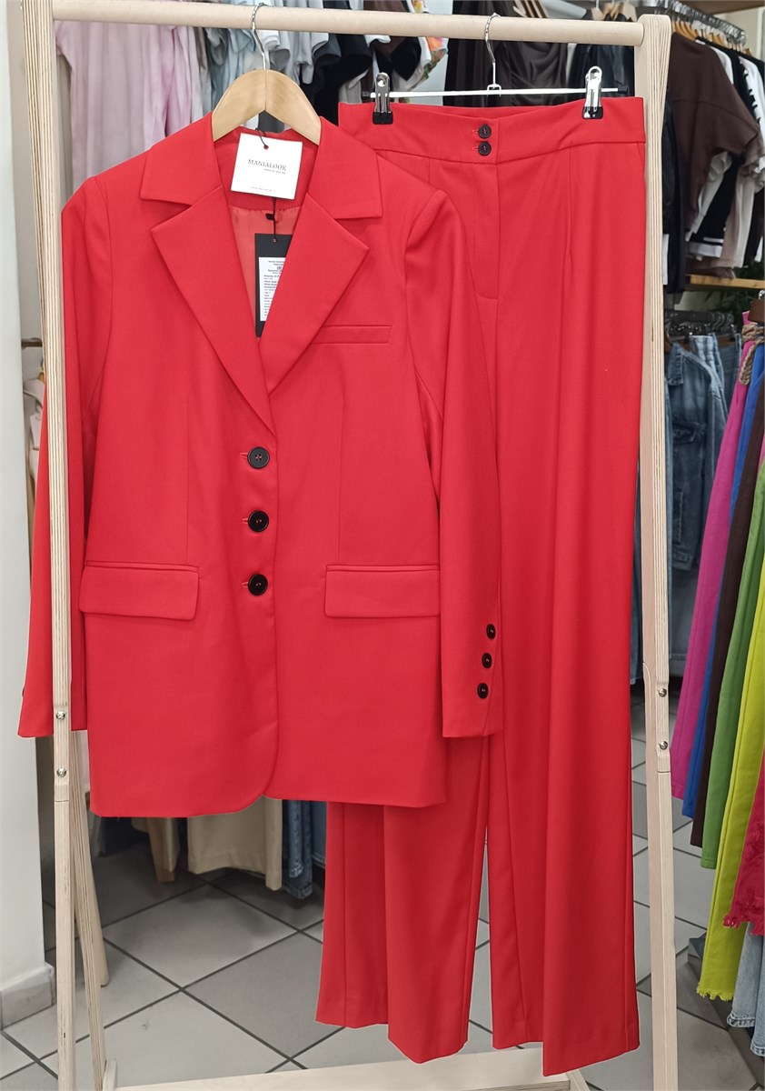 Костюм-двойка из свободного жакета со шлицами и прямых брюк-палаццо.